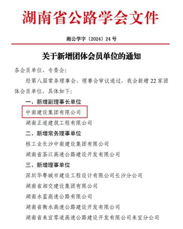 近日,湖南省公路学会传来喜讯,经学会常务理事会、理事会审议通过,决定新增中南建设集团有限公司为副理事长单位。本次成功入选,是学会及同行对公司树行业标杆、当行业典范的认可与肯定,更是公司多年来在公路、桥梁领域始终坚持理论与实践结合、研发与创新并重,取得丰硕技术成果和显著社会效益的有力证明,既提升了公司在行业的影响力,更增添了发展动能与信心。