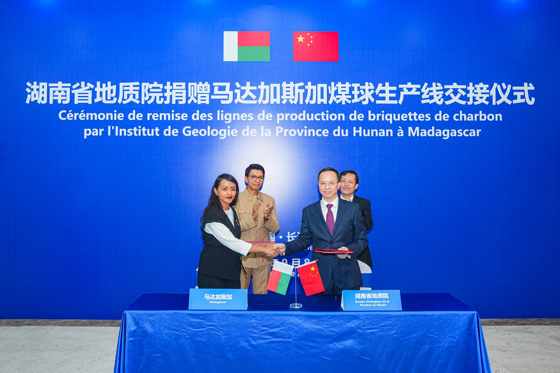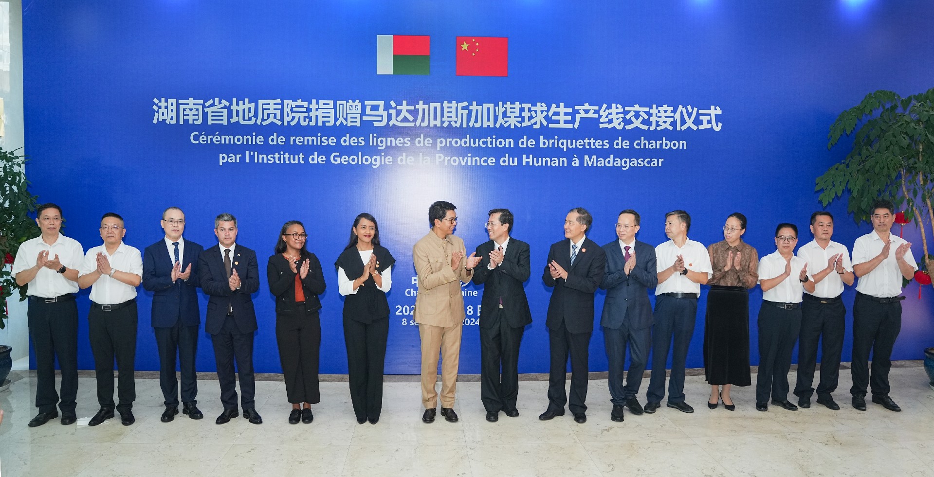 9月8日下午,来华出席中非合作论坛北京峰会的拉乔利纳总统来到湖南省地质院、湖南省地质实验测试中心考察地质科研情况并出席湖南省地质院捐赠马达加斯加煤压球生产线交接仪式。