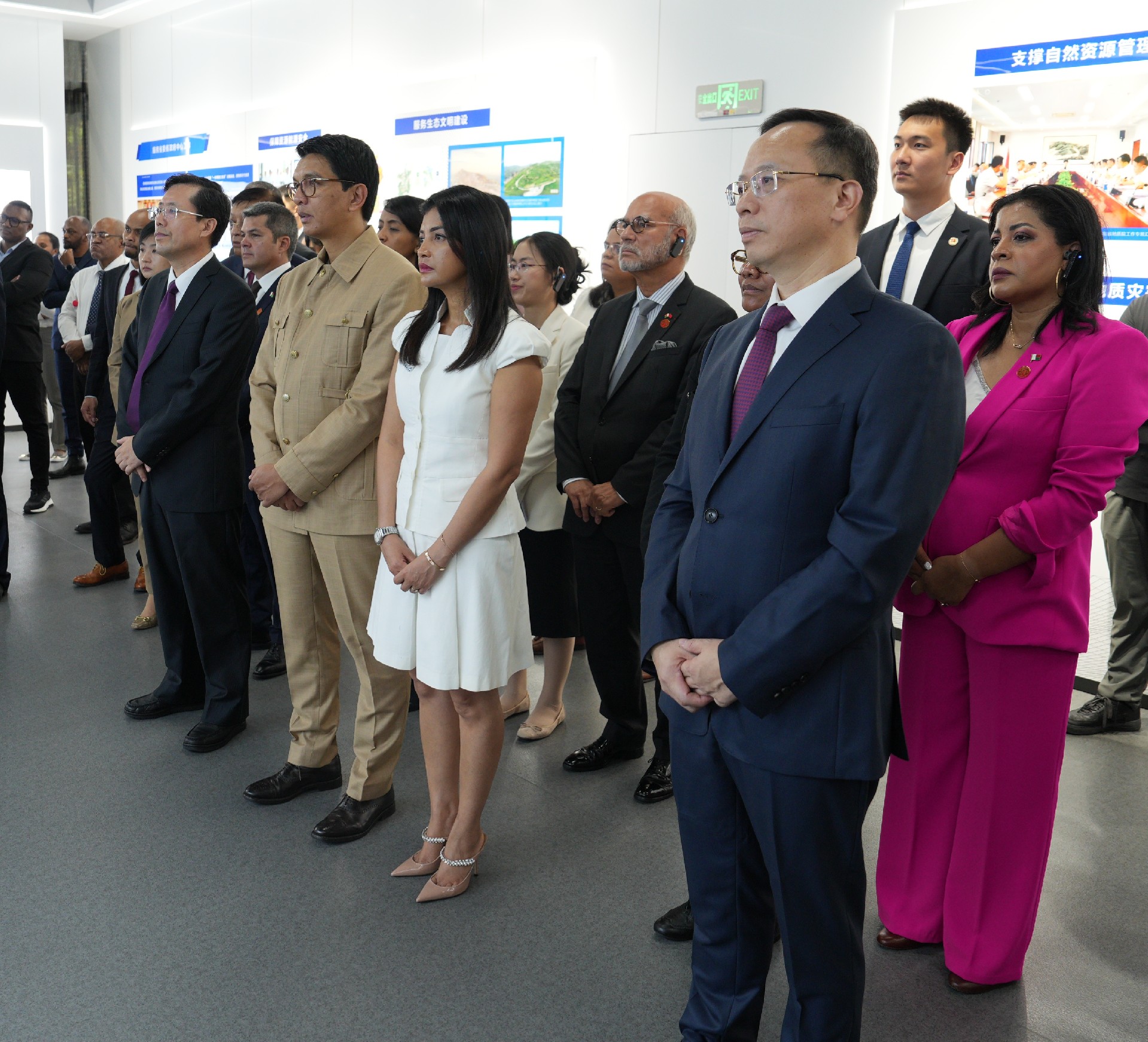 马达加斯加外交部长拉萨塔、教育部长沙洪查里马拉拉、工业和贸易部长拉兰博菲林加、马达加斯加驻华大使罗班松,中国驻马达加斯加大使季平、湖南省人民政府副省长、公安厅厅长王一鸥出席捐赠仪式,省地质院党委书记谈文胜等相关单位负责人参加?!爸蟹怯押?,跨越山?!钡拿篮迷妇霸诤鲜〉刂试红陟谏?。